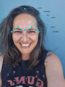 - כאב ראש מצחי (ומאחורי העיניים) – ללחוץ על GB14 (בחריץ בעצם המצח רוחב אצבע מעל מרכז הגבה, מעל האישון), YINTANG (העין השלישית, בין הגבות), BL2 (נמצאת בנקודה רגישה בשקע בעצם ארובת העין, בתחילת הגבה בצדה הפנימי). קשור לעיכול, לחולשת צ'י טחול שלא מצליח לשלוח הזנה מעלה (למוח). מה שמשמר את המצב ותורם לחולשה – לדלג על ארוחות, הרבה קפה ובעיקר קר, מזון נא וקר.